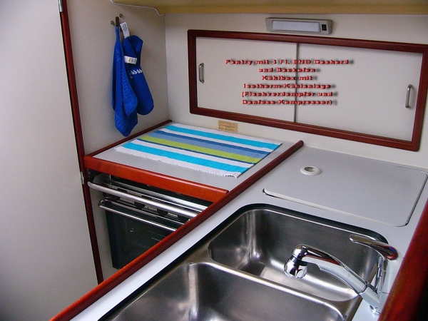 Ich habe eine Dehler 31 Top mit tatsächlich einem Mix aus Mahagoni und weiß im Pantry- und Navi-Bereich.
