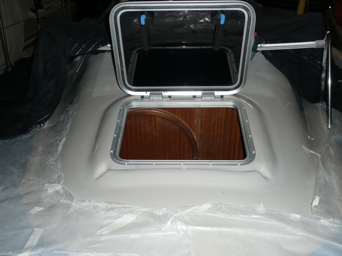 Durch Laminierarbeiten muss die Öffnung an die Luke angearbeitet werden. Anders geht es nicht. Danach wurde mit farblich angemischtem Gelcoat angearbeitet und geschliffen. Von Innen habe ich einen dünnen Holzrahmen als Abdeckung der Durchgangsschrauben im Kunststoff verschraubt. So "schön" wie original ist es nach dem Umbau innnen nur schwierig herzustellen. Hier müsste eine teure Form angefertigt werden um einen Rahmen zu laminieren. Aussen ist alles dicht / Mücken nicht mehr im Vorschiff !!