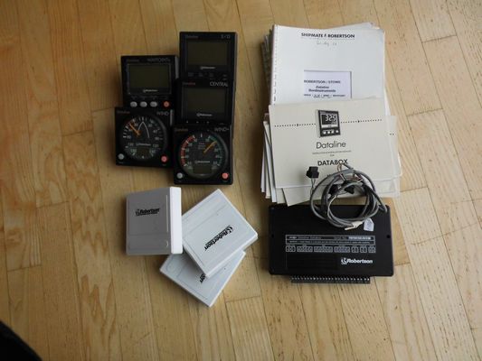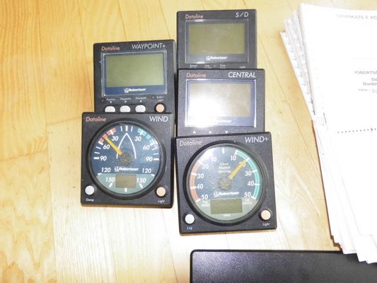 Anzeigeinstrumente Dataline von Robertson: Wind und Windlupe (hier sind die vorstehenden Displayscheiben zerschrammt aber gut ablesbar), Speed und Tiefe Kombianzeige, Waypoint, und Zentral Display, dabei die Data Box, 3 Abdeckungen, sämtliche Handbücher.