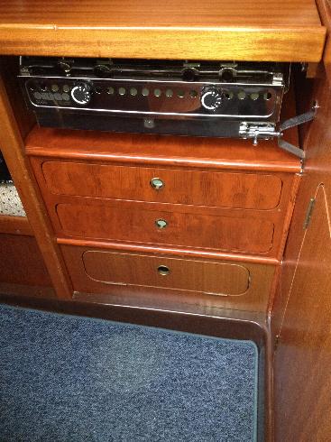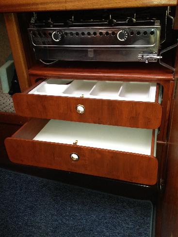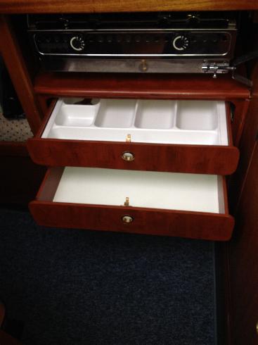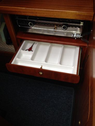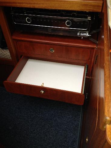 Ich habe einen kleinen Schrank mit 2 Schubladen zuhause gebaut, den ich dann auf dem Schiff nur noch einschieben mußte.