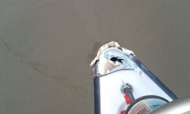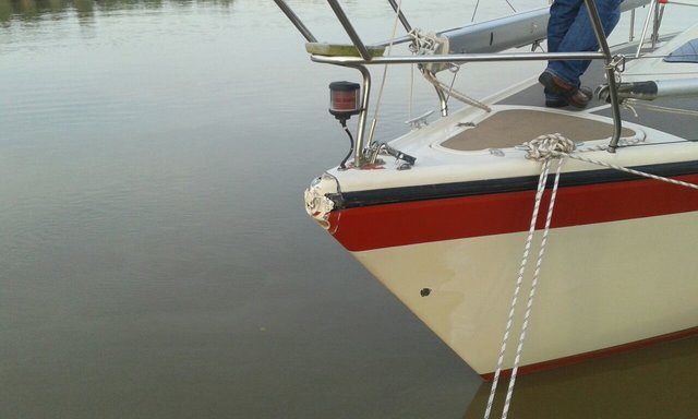 leider ist mir im Herbst ein anderes Boot beim ablegen in meinen Bug/Nase gefahren. Ergebnis ist leider ein verbogener Bugkorb, Ankerbeschlag irgendwo auf dem Grund und im GFK ein unschönes Loch (siehe Bilder).