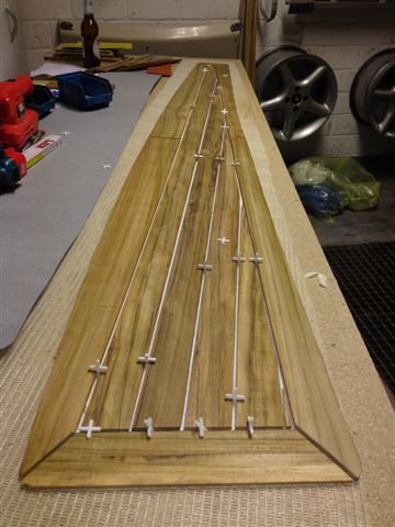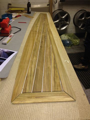Da alles viel schneller ging als gedacht, habe ich die einzelnen Flächen in meiner Garage komplett verklebt, und anschließend plangeschliffen. Zu guterletzt habe ich sie als fertige Matte nur noch aufs Schiff kleben müssen.