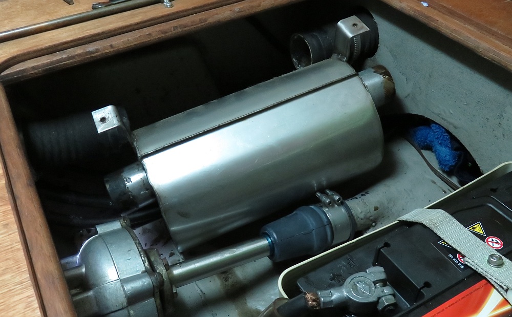 Da ich irgendwelche Teile vom Yanmar 2GM20 Motor (Zinkanode, Thermostatteile oder schlimmeres) im Schalldämpfer befürchtete, habe ich ihn ausgebaut und kontrolliert, nichts klappert, keine losen Teile im Topf. Unten hatten die Bouwdenzüge von Gas und Getriebe leicht am Topf gescheuert, die habe ich mit Heizungsisolation umwickelt. Alles wieder zusammengebaut, das Geräusch ist unverändert immer noch da, als ob Hagelkörner von innen an die Topfwand fliegen. Fasse ist den Topf an, ist das Geräusch weg. Kann es sein, daß da mal eine Matte, Stahlwolle oder ähnliches zur Geräuschdämmung drin war?