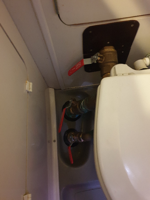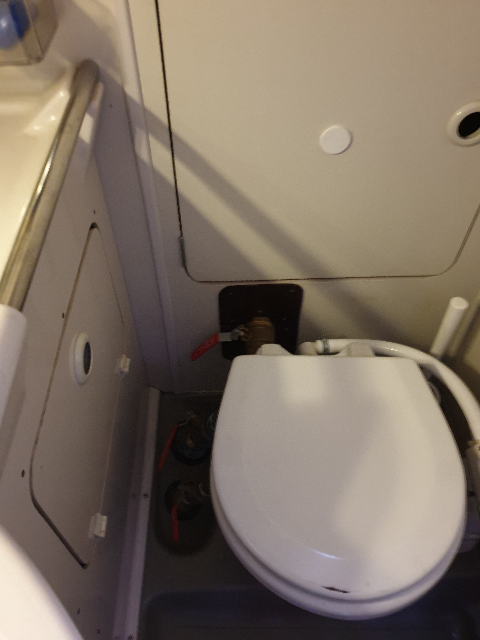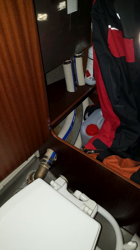 Er hat allerdings (noch) keine Möglichkeit zur Absaugung. Von der Toilette aus wird in den Tank gepumpt, der Anschuss reicht über ein innenliegendes Rohr bis kurz vor die obere Deckenwand des Tanks (damit es nicht gleich wieder rausläuft). Eine zweite Leitung entleert den Tank zurzeit außerbord, wenn ich den Borddurchlass öffne.