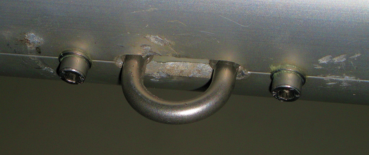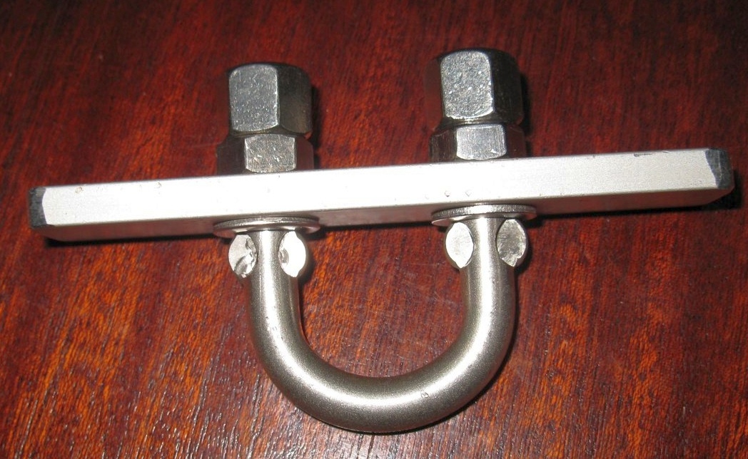 Das ist ein ganz normaler 8mm U-Bolzen in einem Alfer-Alu-Profil 20x6 aus dem Baumarkt. Die Unterlegscheiben habe ich weggelassen. Damit die Reffleinen im Baum nicht beschädigt werden, sind auf dem abgesägten U-Bolzen noch Hutmuttenr drauf. Die Pop-Nieten sind durch M6 Inbus ersetzt.