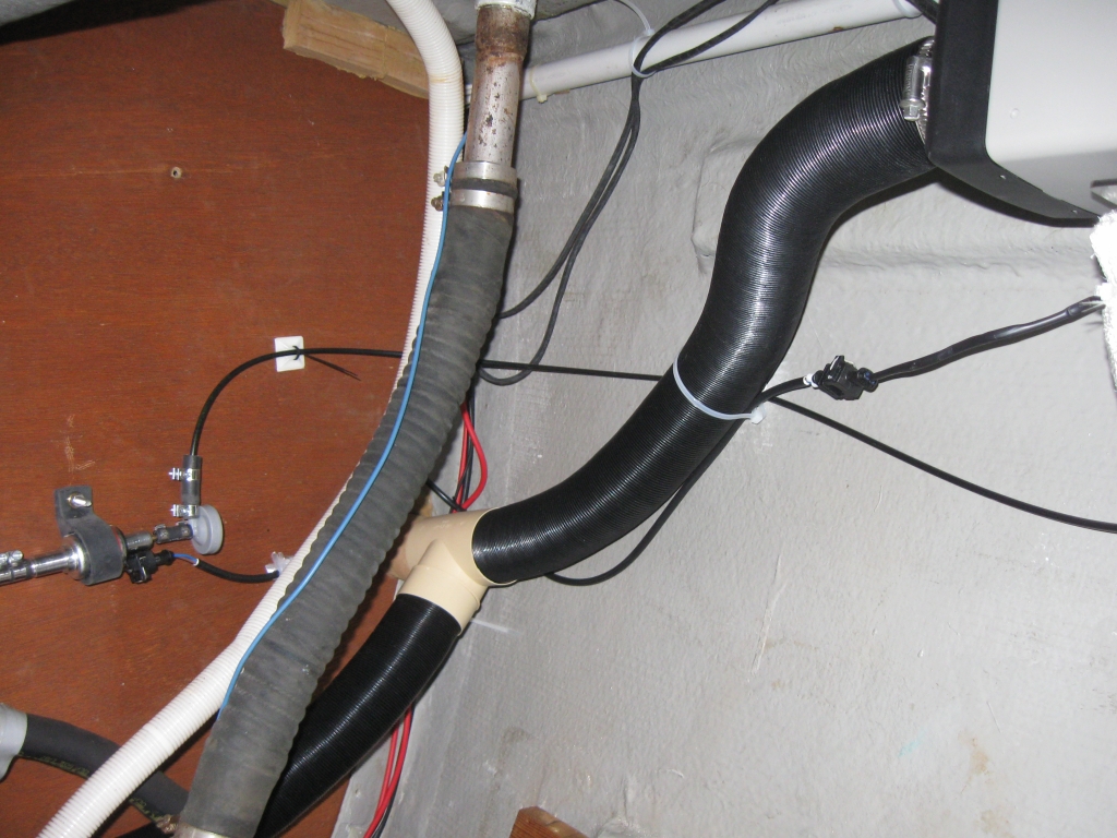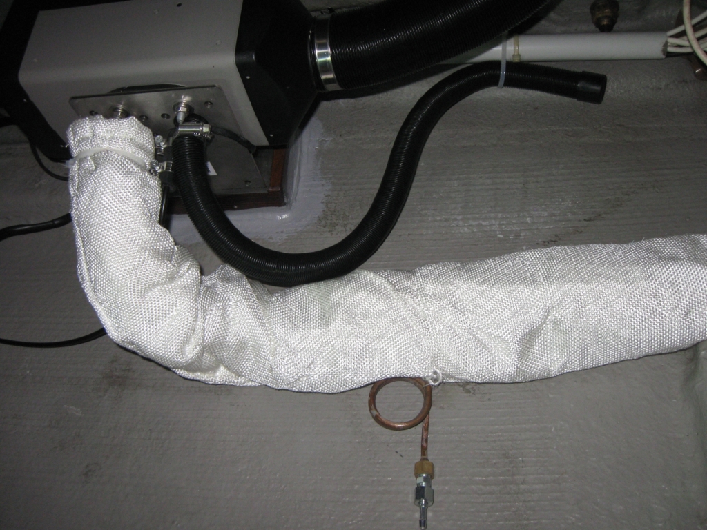 De warme luchtslang met 60 mm doorsnede moet geisoleerd worden, anders teveel warmteverlies. Ik heb dit gedaan met material uit de bouwmarkt. Een aluminium flexibele buis met doorsnede 120 mm. ( Wordt gebruikt voor luchttranport, afvoer in de keuken ). Eerst de warmteslang van 60 mm doorsnede omwikkelen met isolatiemateriaal en de grotere aluminium buis erover heen schuiven. Van compartiment tot compartiment werken, dus geen grotere gaten in de wanden boren. Dit is niet nodig.