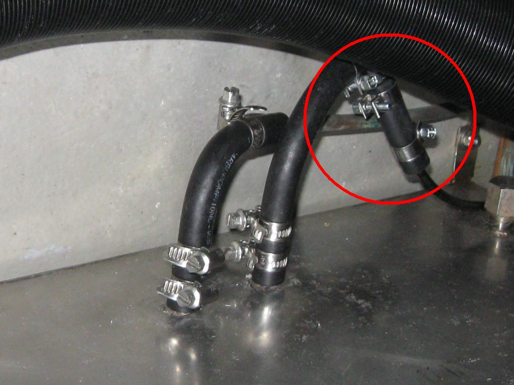 Links der Rücklauf vom Motor zum Tank. Im rechten Tankanschluss befindet sich ein T-Stück. Ein solches T-Stück wird (zumindest bei Webasto) mitgeliefert. Leider ist es auf dem Foto halb verdeckt durch den Warmluftschlauch für die Achterkoje.