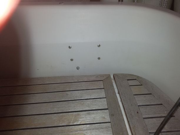 ergänzend zu den Erklärungen von Franz: Bei mir sitzt die Heizung ebenfalls in der Backskiste, allerdings höher als bei Franz - im Süll. Zur genauen Position kann ich nur das Foto mit den 4 Schrauben der Halterung beifügen. Der Warmluftschlauch ist dann schon in der Backskiste an der Rückwand des Ölzeugschranks nach unten geführt und geht unterhalb des unteren "Regalbretts" in diesen und von dort weiter nach vorn zwischen Wand der Nasszelle und Rumpf. Verbaut ist die 'kleine' Eberspächer mit 2 kW, die sich den Brennstoff über ein T-Stück aus der Dieselleitung zum Motor holt.