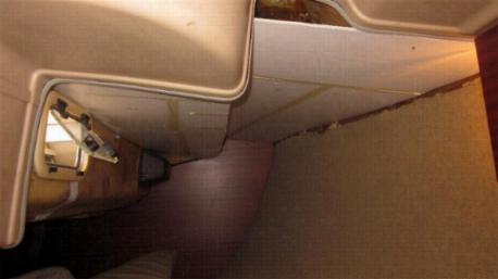Der Voreigner hatte versucht mit langen schmalen Textilstreifen die Kajüte zu bekleben, was allerdings auf Grund der vielen Rundungen und Bögen ziemlich amateurhaft aussah. Also runter damit, die 1. große Baustelle.