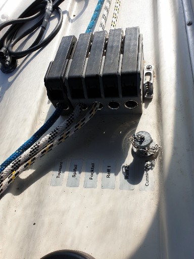 Nachtrag: Für die Genakerschoten nutze ich die Klemmen außen am Süll, Genakerhalsleine stb auf dem Süll, Spischoten auf dem Süll, natürlich nur, wenn gerade keine Winsch frei ist.