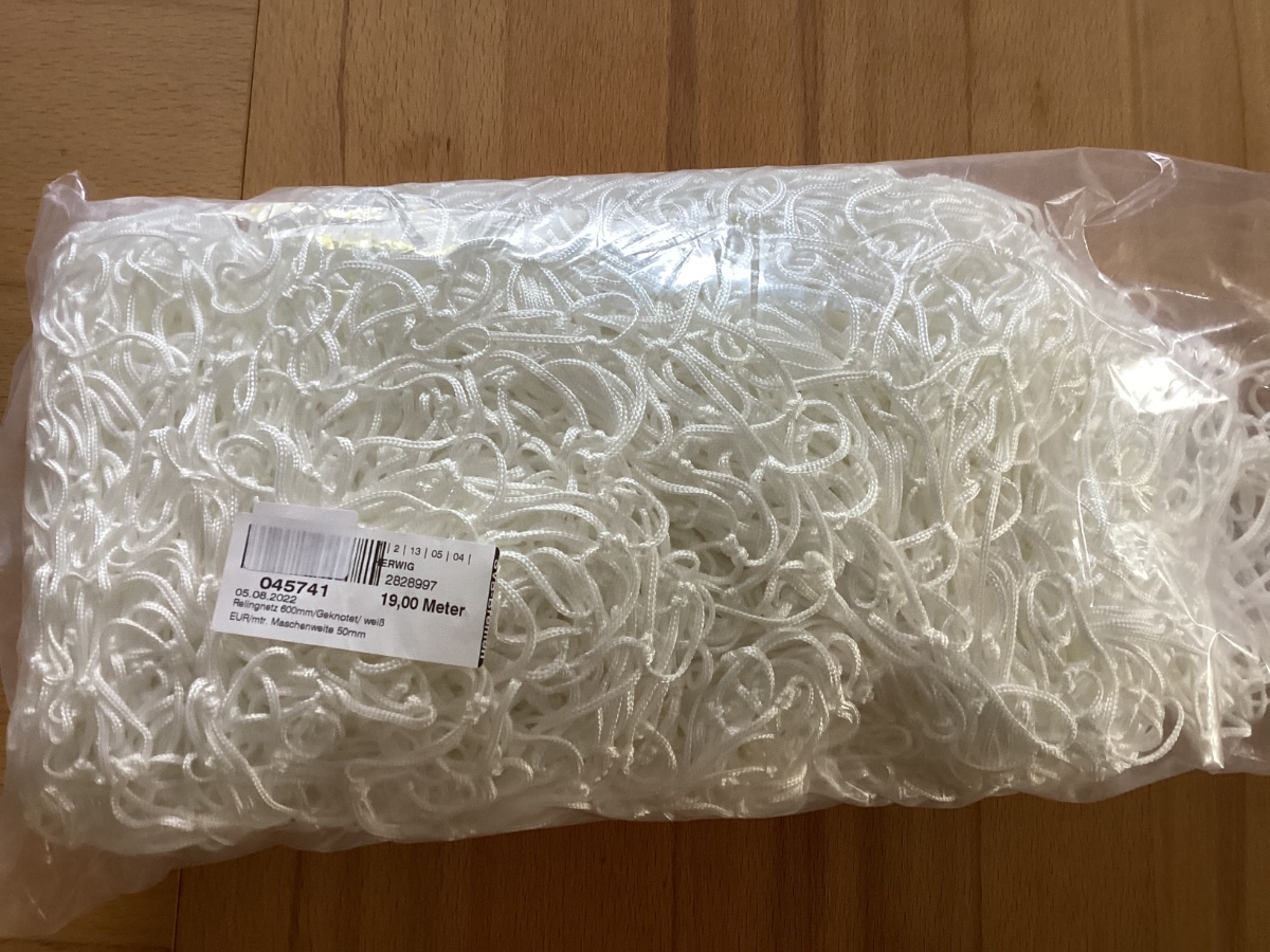 60 cm hoch, 19 Meter lang, geknotet, Maschenweite 50 mm.