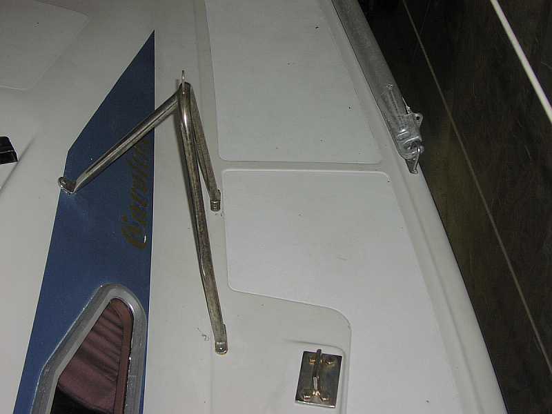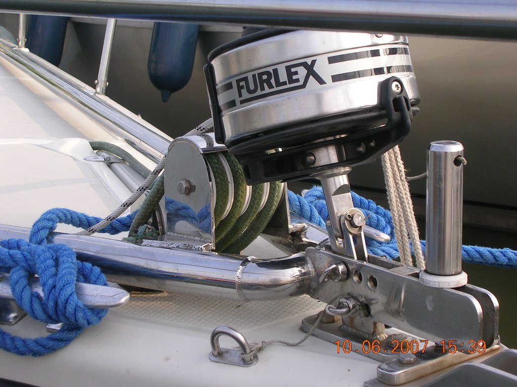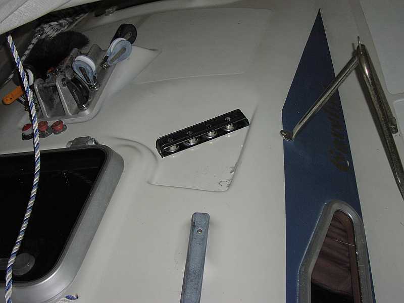 Details dek/voorstag. Contructie is zodanig dat ik niets heb hoeven aanpassen aan voorstag, foktrommel, drinkwaterdoorlaat etc.