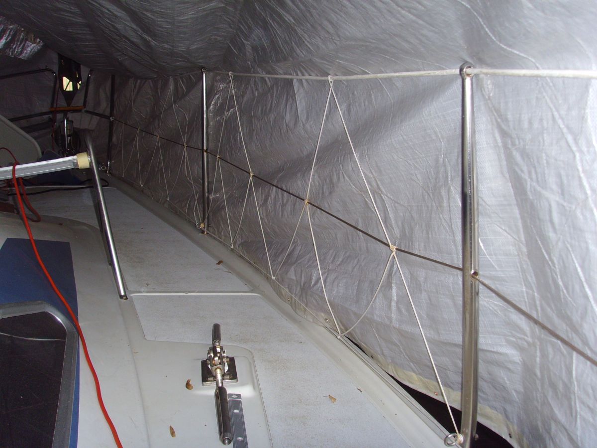 Um zu verhindern, dass das Segel beim bergen ins Wasser fällt (ich bin einer der wenigen ohne Rollanlage), habe ich ebenfalls dünne Leinen an der Reling gespannt. Die untere Befestigung habe ich dabei durch eine Leine hergestellt, die stramm zwischen den Augen unten an den relingstützen gespannt ist.