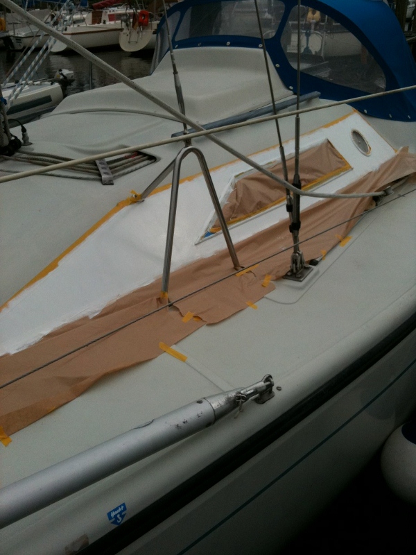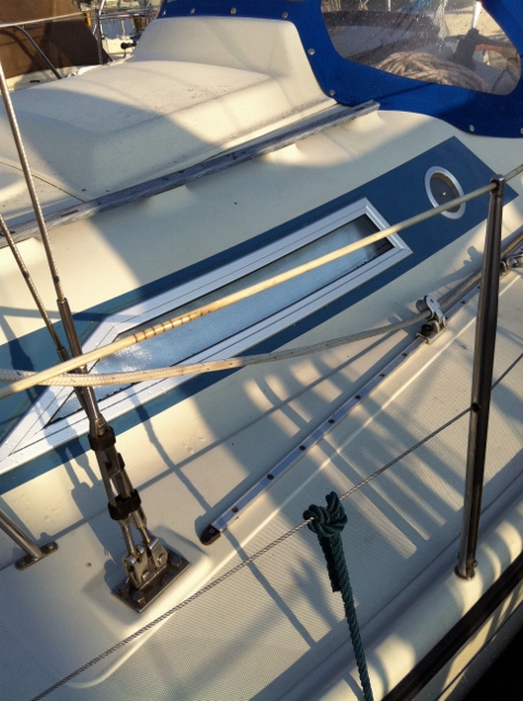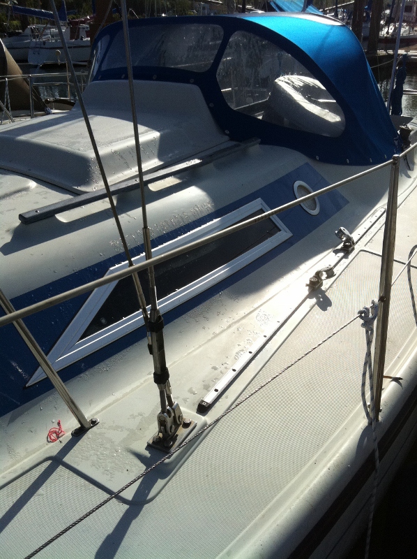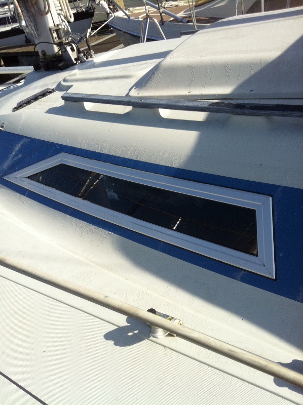 So wurde aus einem aufgesetzten Duetta 94 Fenster, welches regelmäßig undicht war, ein eingelassenes Fenster im Aluprofil auf frisch lackiertem Blauen Streifen (Flugzeuglack statt Gelcoat).