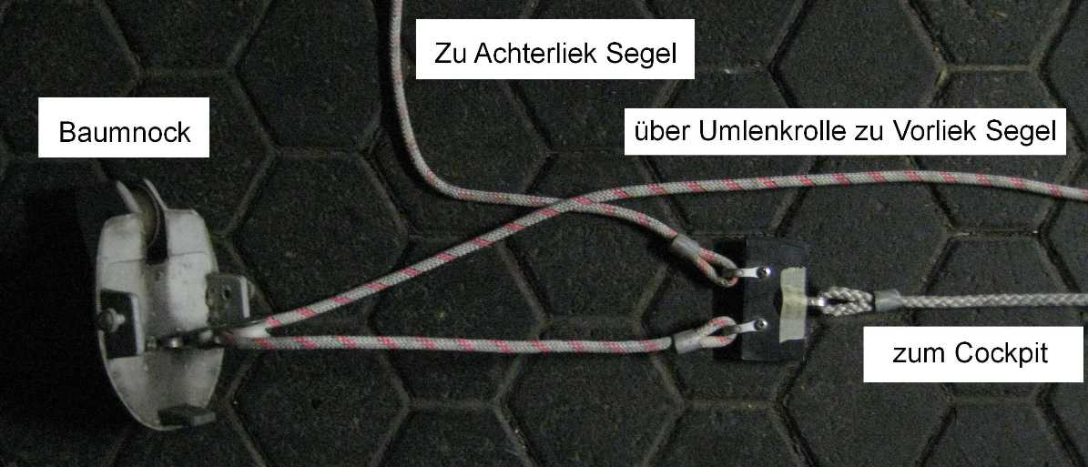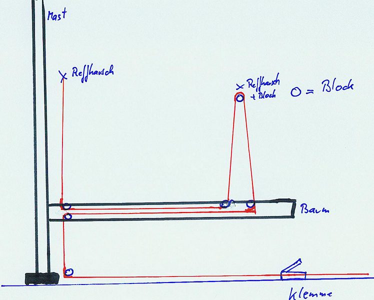 Hallo Ralf, Reffleine 1 geht zum Segelhals, wird aber im Baum vorher noch über eine Rolle umgelenkt. Die Rolle ihrerseits zieht eine mit ihr verbundene Rolle nach vorn , über die die Reffleine 1 für das Achterliek umglenkt und nach vorne gezogen wird. Alles klar? Gruß Bernhard