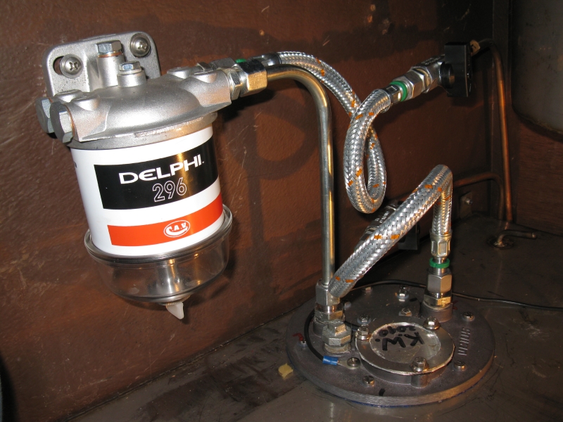 habe in den letzten tagen den tank ausgebaut und eine kontrollöffnung eingebaut. der tank passt durch die backskistenöffnung (ziemliche fummelarbeit), wenn alle drei befestigungslaschen und die entnahmeanschlüsse umgebogen werden. die große öffnung für den neuen vetus anschlusskit habe ich so ausgesägt, dass die alten entnahmeröhrchen wegfallen. den dieselpils am boden des tanks konnte ich durch die öffnung mit einer holzleiste und vielen lappen entfernen. in zukunft werde ich dem diesel immer grotamar beifügen, dass sowas nicht nochmal passiert. gleichzeitig habe ich einen neuen vorfilter mit wasserabscheider eingebaut. er darf nicht höher hängen, als der alte, da sonst die förderpumpe überfordert ist.