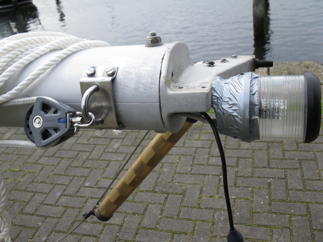 eingezogen nicht, aber ich habe an der vorderseite des mastes einen kleinen bügel mit rolle befestigt. das geht recht einfach, wenn man die endkappe des mastes abnimmt und dann die schrauben durchbolzt (M5). alternativ kann man auch gewinde schneiden und die schrauben mit logtite einsetzen. das fall läuft dann natürlich außen. nicht im gebrauch, wird es um die saling geschlungen und geht auf die klampe am mast. das ist praktisch, denn zum setzen muss man sowieso aufs vorschiff.
