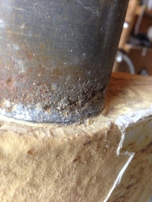 Aber ich glaube es liegt vielleicht an etwas anderem: Auf dem Schaft befand sich im Bereich des unteren Lagers eine Edelstahlhülse, die Lager oben und unten sehen recht gut aus, so als ob der Vorbesitzer dort einmal eine Erneuerung mit dem Set aus Grossenborde gemacht hat. Allerdings wird dort ja empfohlen, die Edelstahlhuelse mit Epoxidkleber am Schaft zu verkleben. Das war auf jeden Fall nicht gemacht worden. Die Hülse lag einfach locker um den Schaft. Vielleicht hat der Edelstahl im Kontakt mit dem Wasser unten die Korrosion im Alu verursacht.????