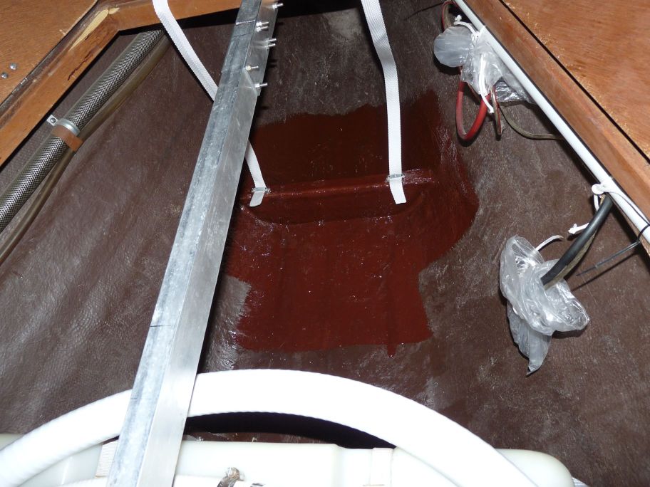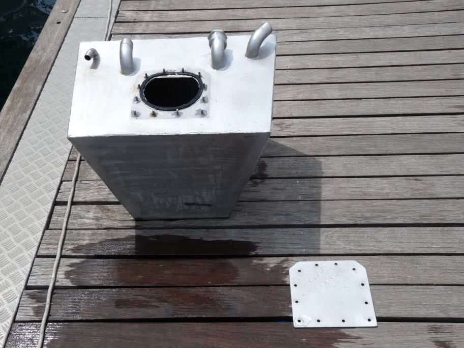 habe jetzt den Fäkalientank in Edelstahl in der Türkei schweißen lassen. Vorher ein Muster in Karton hergestellt. Man muß aufpassen, daß der Tank auch durch die Türe paßt. Aufstellort im Bug unter den Kojen. Dazu habe ich noch einen Steg anlaminiert, um dort die Befestigungsgurte anbringen zu können. Hinten sind die Gurte an den Holzstegen des Frischwassertanks befestigt. Ich wollte den Toilettenschrank doch nicht ganz zerlegen. Der Tank faßt ca. 80 Ltr. Auf einem Foto sieht man auch die neue Toilette. Wegen der vielen alten Bohrungen habe ich eine Edelstahlplatte drunter montiert. Abgepumpt wird der Fäkalientank mit einer Handpumpe. Von der Toilette geht alles erst einmal in den Tank. Zur Zeit ist erst einmal eine Außenbordentleerung vorgesehen. Die Abpumpentleerung muß noch gemacht werden, Anschluß ist aber vorhanden. Zur Montage mußte das Alurohr aufgesägt werden und mit zwei Aluplatten anschließend wieder verbunden werden.
