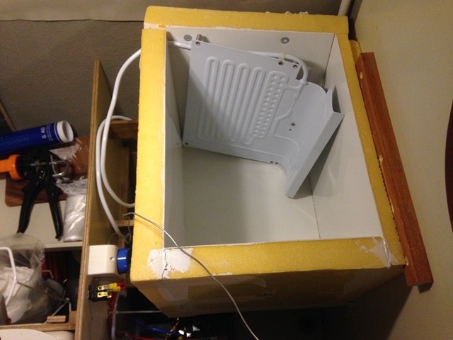 Pantryrückwand ausbauen (wird wiederverwendet), Arbeitsplatte ausbauen, Kühlbox hinter Spülbecken und Außenwand einbauen, neue Arbeitsplatte aus Multiplexmaterial von Schreiner fräsen lassen, Wanne für Kocher anfertigen und einbauen, alles wieder zusammenbauen.