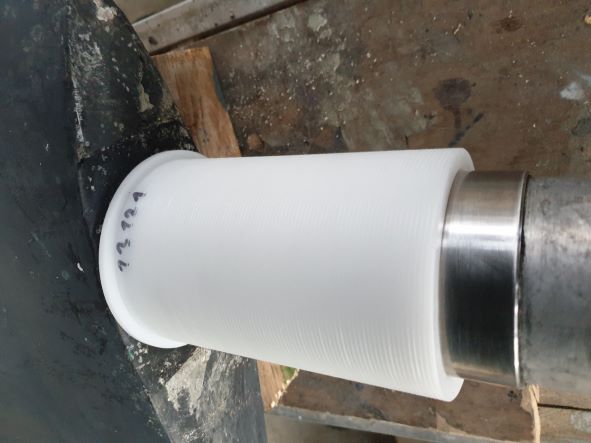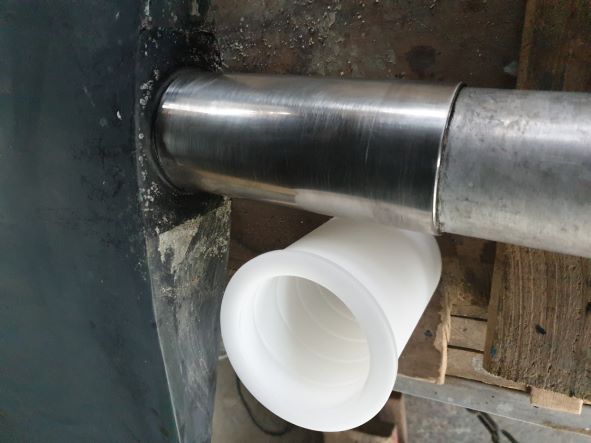 6. Ausbau. Die alte Hülse kann nur mit Gewalt entfernt werden, Werkzeug: Säge,Hammer, Stechbeitel. Das Lager von oben durch den Koker nach unten herauszuschlagen sollte man nicht versuchen, weil dadurch die Laminatverbindung zwischen Rumpf und Ruderkoker gelockert werden könnte. Nach 30 Min. und ein paar Versuchen wie der Stechbeitel anzusetzen ist, ist die Hülse raus.