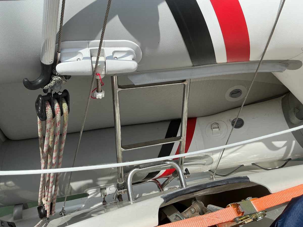Hallo nochmal, zur weiteren Erläuterung: Auf meiner 32 ist die Badeleiter in der Mitte, deshalb klappt das mit der Halterung für das Schlauchboot so gut. Zur Verdeutlichung habe ich 2 Foros beigefügt.