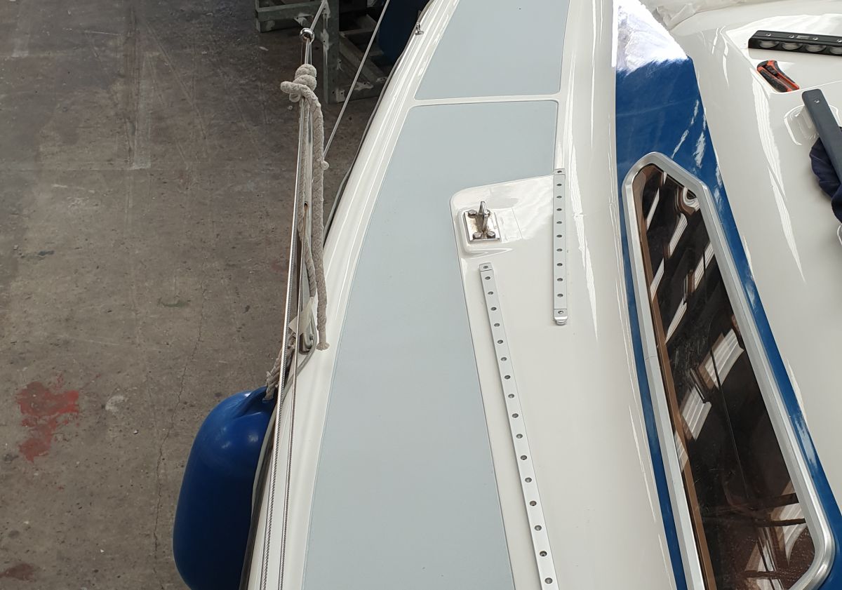 Die 50 cm Schienen habe ich mit 5 Schrauben (plus zwei für die beiden Endstücke) befestigt. Die Schraubenlöcher sind durchgebohrt. An dieser Stelle befindet sich KEINE einlaminierte Alu-Platte. Unter Deck kann man dann im Salon an der Decke die 7 Löcher sehen. An dieser Stelle habe ich die Decke etwa 3cm breit aufgeschlitzt und eine ca, 55 cm langen Schiene aus 3mm Edelstahl mit Epoxy eingeklebt, die als Konterung für die Genuaschiene dient. Alternativ könnte man auch eine Alu-Genuaschiene nehmen.