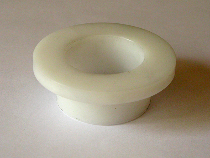 Das Material PA6 (gut für Gleitlager und leicht zerspanbar) habe ich mir in einem Kunststoff verarbeitenden Betrieb in Berlin als Reststück für 5,00 EUR Gabe in die Kaffeekasse besorgt. Mehr habe ich nicht ausgegeben. Den Quader habe ich zunächst mit einer 90mm-Lochsäge an der Standbohrmaschine rundgeschnitten. An der Drehbank in der Werkstatt eines Crewmitgliedes habe ich dann selbst gedreht. Die Drehbank aus den 30er Jahren des vorigen Jahrhunderts musste ich erst kennenlernen und immer wieder mit der Schieblehre nachmessen - Dies hat für mich als jemanden, der vorher noch nie als Dreher gearbeitet hat, eine Stunde gedauert und so sieht es aus: